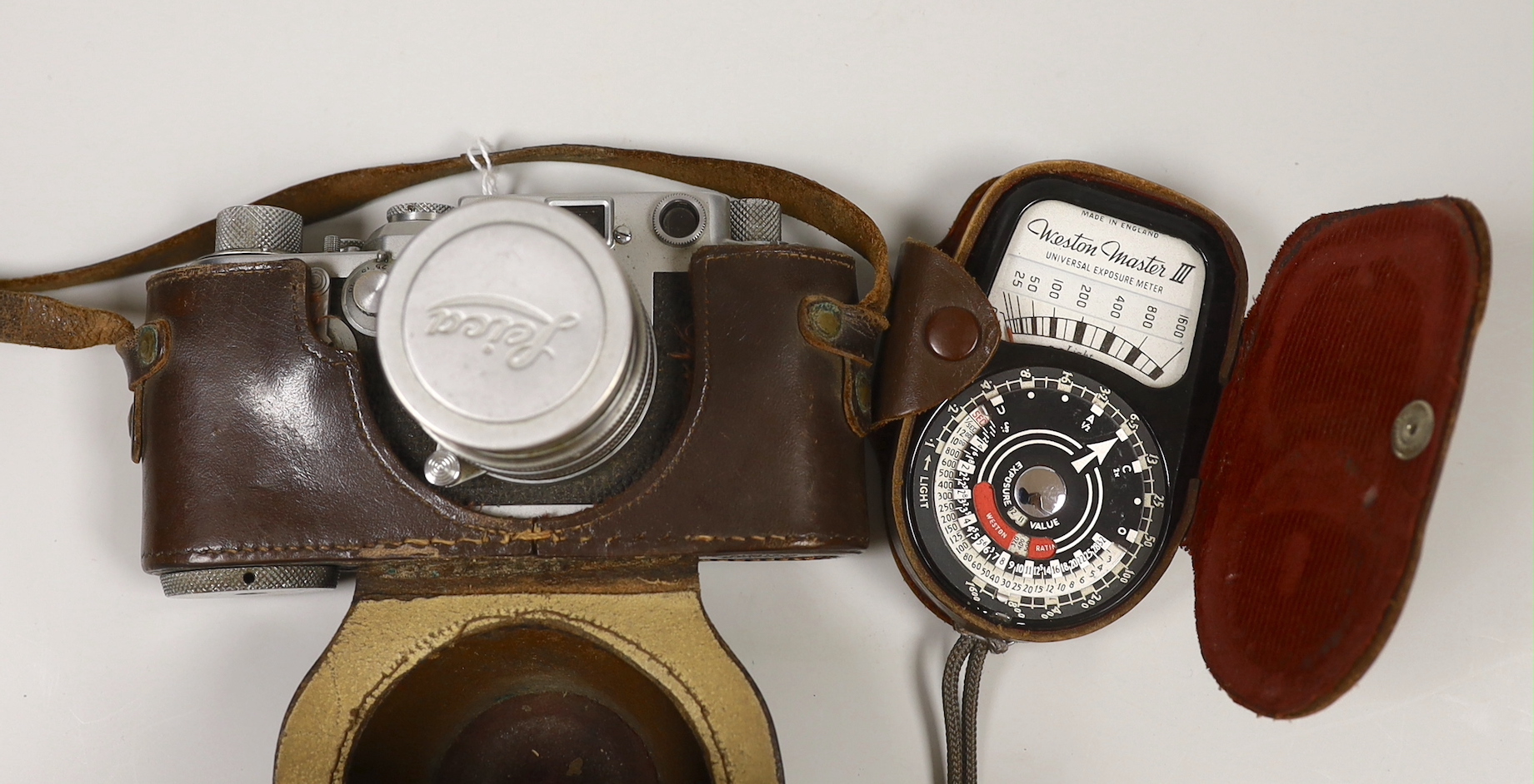 A cased Leica III camera serial number 767261 with Ernst Leitz GmbH Wetzlar Summarit f=5cm 1:15 No.135729 lens and light exposure meter