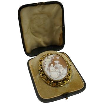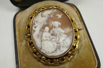 Lot 924 , A cased Victorian gilt metal mounted oval cameo shell brooch, carved with the scene of a lady and gentleman beneath a tree, 57mm.