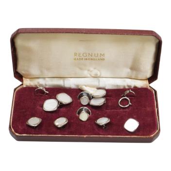Lot 931 , A cased mother of pearl mounted base metal eight piece dress stud set.