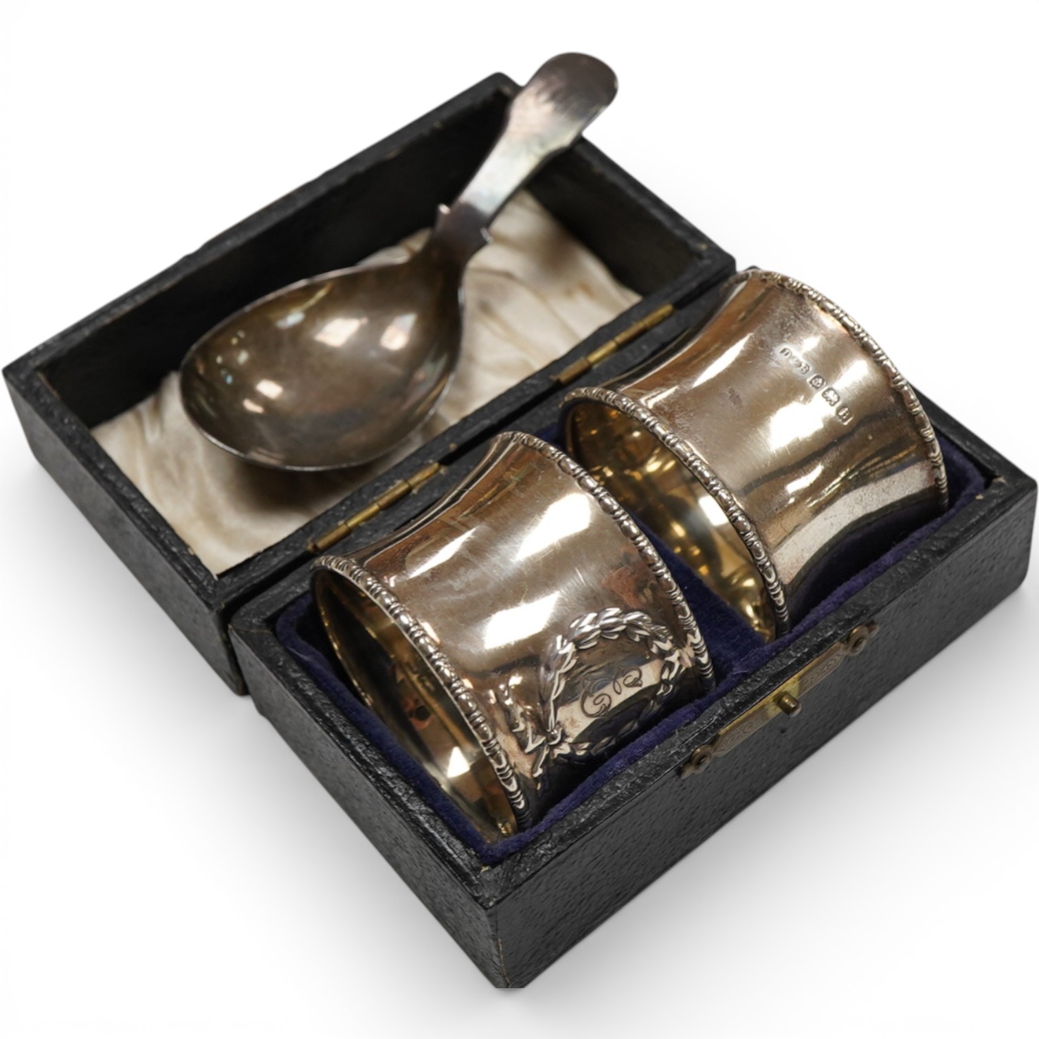 A cased pair of George V silver napkin rings, Docker & Burn, Birmingham, 1926, together with a George III silver fiddle pattern caddy spoon, by Elizabeth Morley, London, 1808.