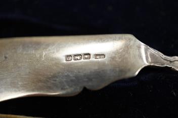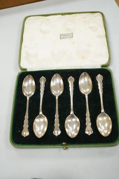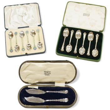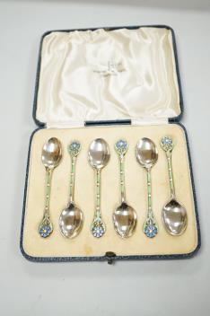 Lot 1828 , A cased set of six Edward VIII silver and enamel coffee spoons, with foliate terminals, Walker & Hall, Birmingham, 1936, a cased set of six Harrods silver coffee spoons and cased pair of silver butter knives.