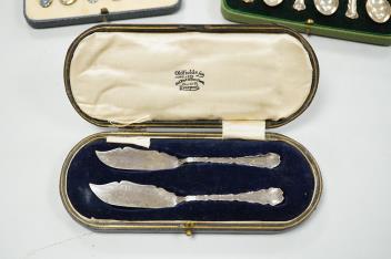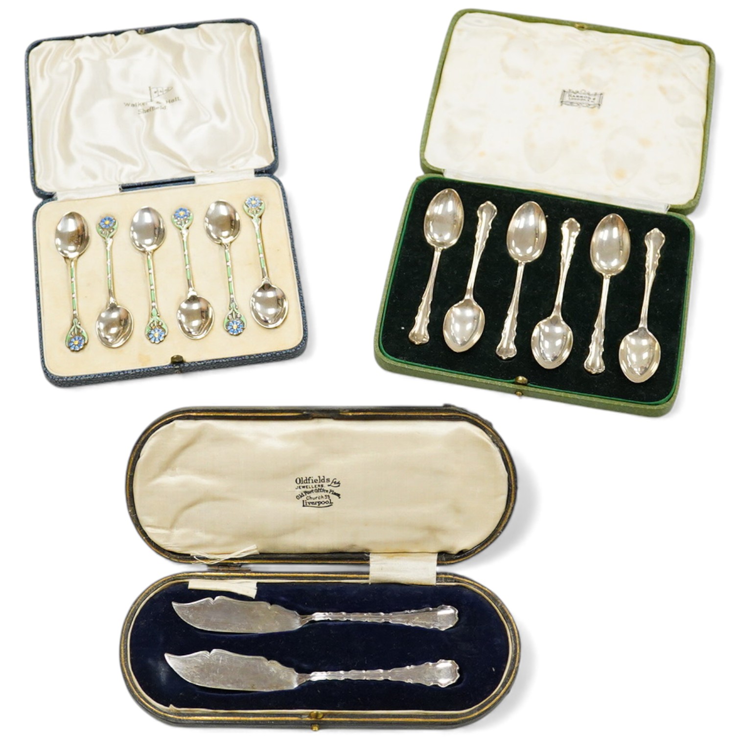 A cased set of six Edward VIII silver and enamel coffee spoons, with foliate terminals, Walker & Hall, Birmingham, 1936, a cased set of six Harrods silver coffee spoons and cased pair of silver butter knives.