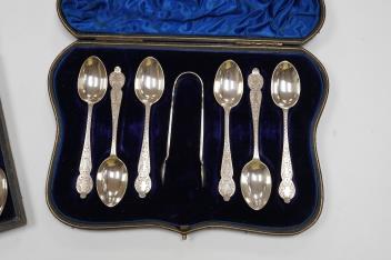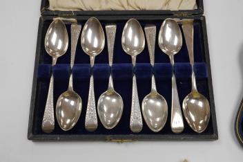 Lot 2834 , A cased set of six late Victorian engraved silver teaspoons with sugar tongs, Wakely & Wheeler, London, 1892, together with eight other silver teaspoons and a silver handled crumb brush.
