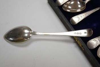 A cased set of six late Victorian engraved silver teaspoons with sugar tongs, Wakely & Wheeler, London, 1892, together with eight other silver teaspoons and a silver handled crumb brush.