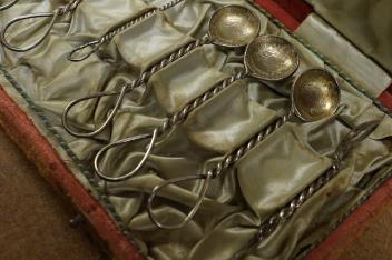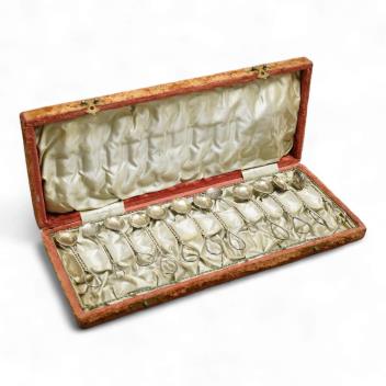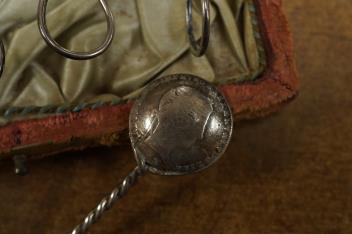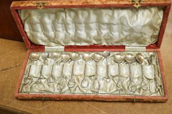 Lot 1825 , A cased set of twelve assorted white metal coffee spoons, with spiral stems and coin bowls.