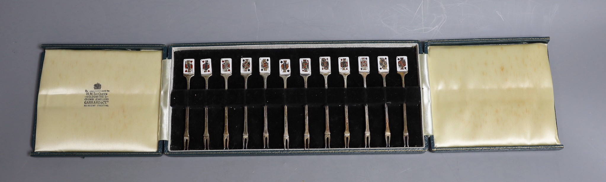 A cased set of twelve early 1960's silver and enamel cocktail sticks, by Garrard & Co, with playing card terminals, Birmingham, 1961.