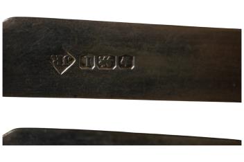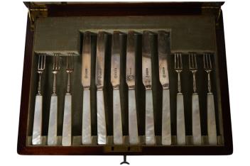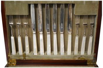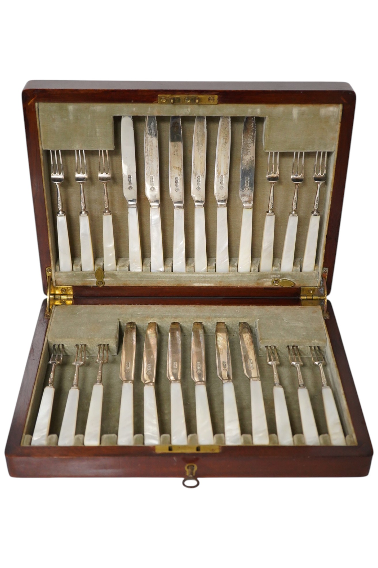 Lot 3844 , A cased set of twelve pairs of George V mother of pearl handled silver dessert eaters, by James Ramsay, Sheffield, 1928, knife 17.5cm.