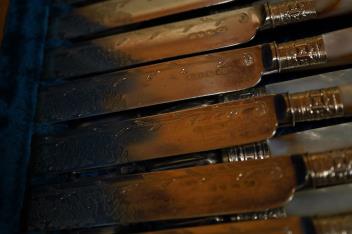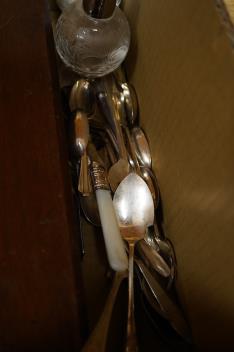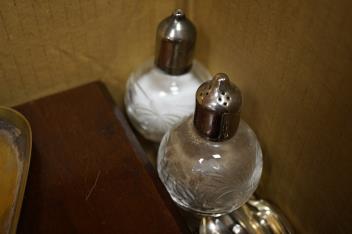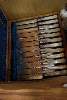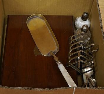 Lot 398 , A cased set of twelve pairs of mother of pearl handled plated dessert eaters and a quantity of assorted plated items including a toastrack, a pair of mounted glass condiments, crumb scoop and miscellaneous flatware.
