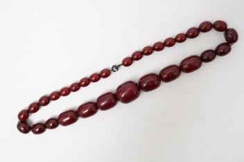 A cherry bakelite 'amber' necklace, composed of graduated oval and cylindrical beads measuring approximately 14-28mm, total length approximately 61cm, gross weight approximately 118 grams