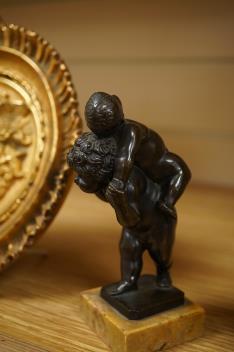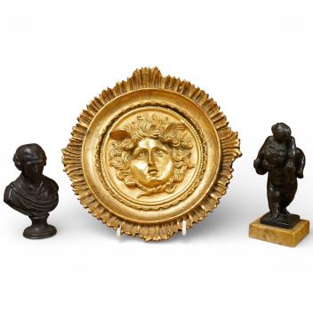 Lot 330 , A circular cast gilt-metal mask in frame, together with a small bronze figure and a spelter bust, largest 20cm in diameter