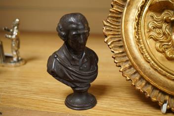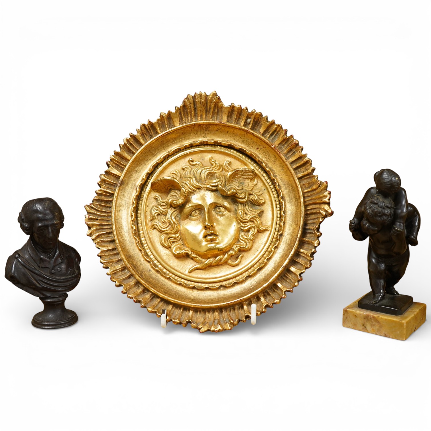 A circular cast gilt-metal mask in frame, together with a small bronze figure and a spelter bust, largest 20cm in diameter