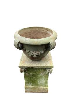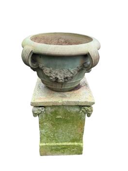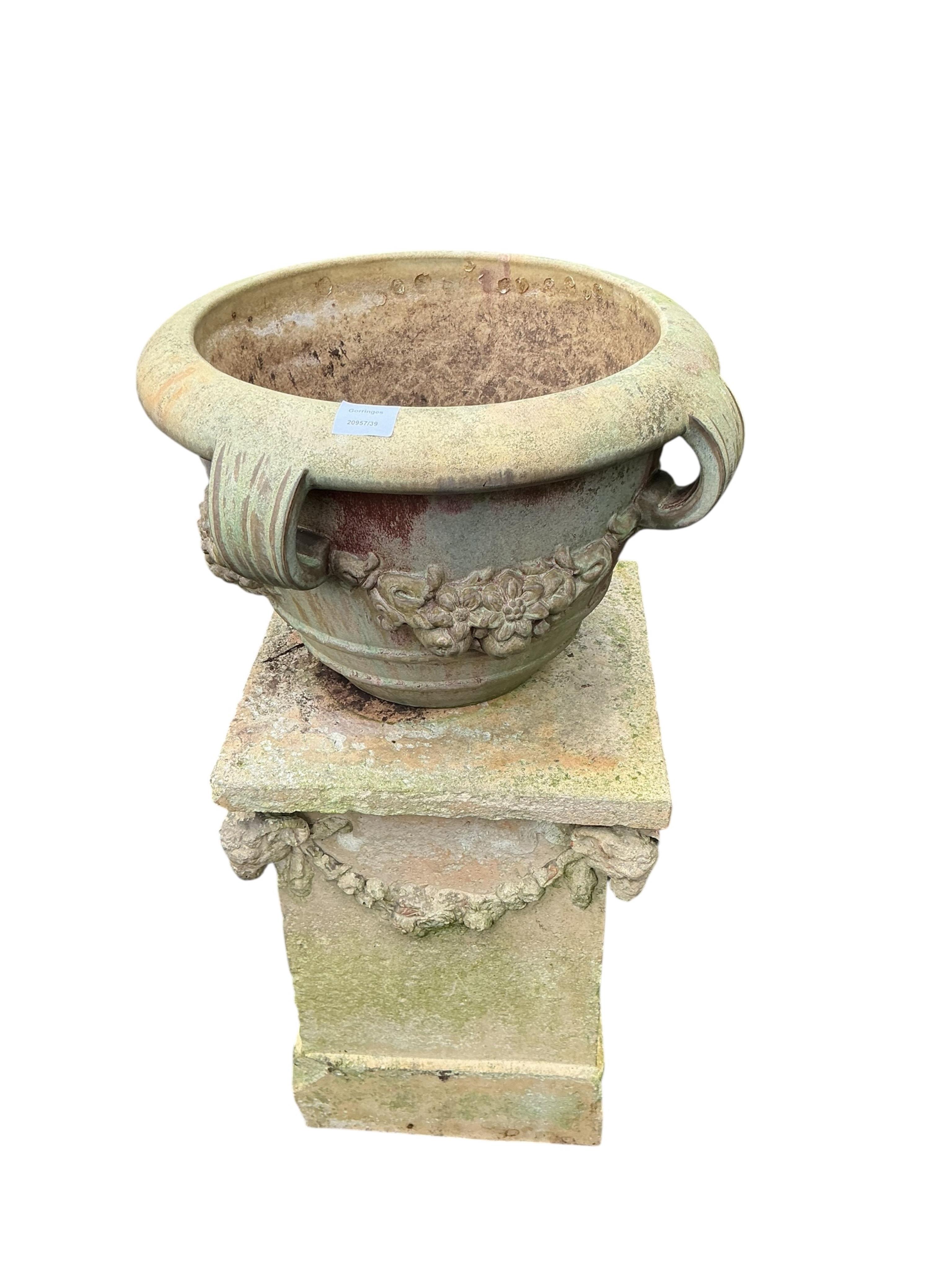 Lot 1003 , A circular glazed earthenware garden planter on an earthenware stand, moulded with rams' heads, total height 88cm
