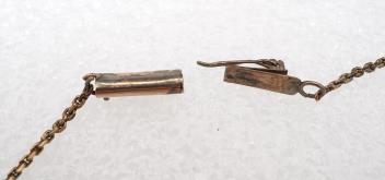 In good condition, minor wear, discoloration to metal - likely silver and gold, or low-carat gold, but not marked and not possible to say conclusively.