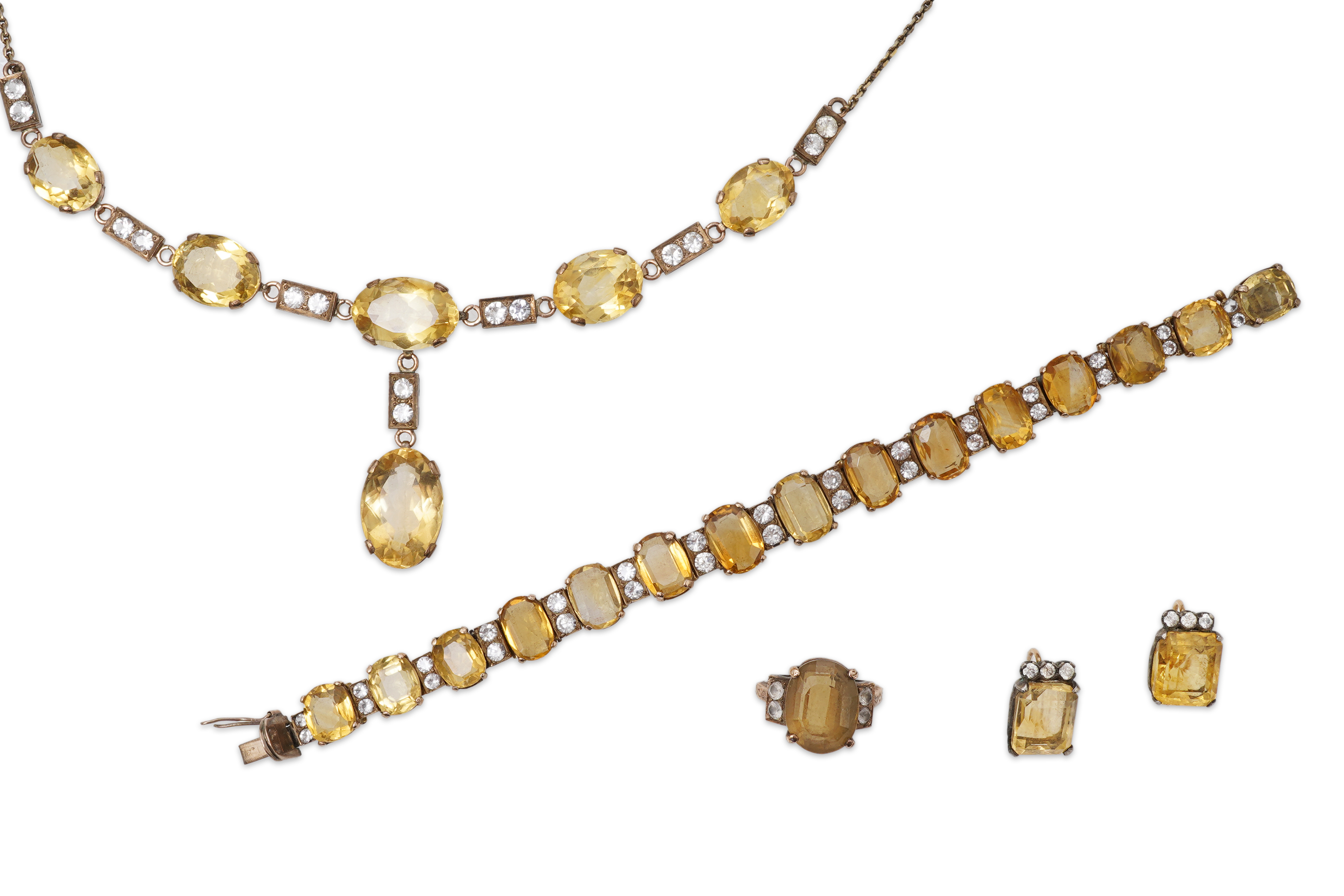 A citrine and white sapphire parure, comprising: a necklace, bracelet, ring and pair of earrings, each set with oval, step-cut or cushion-shaped citrines and circular-cut white sapphires, necklace 44cm, bracelet 17cm; ring size I, earrings 1.4cm, hook fittings, combined gross weight approximately 60 grams