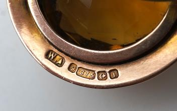 A citrine brooch and pendant, and onyx stickpin, comprising: a pendant set with a step-cut citrine, in an engraved gold mount, length 3.6cm including bail, stamped 9C; a brooch set with a circular-cut citrine in a plain polished gold setting, 2.5cm, British hallmark, date letter for 1908, combined gross weight 17.5 grams; together with a stickpin capped by a shield-shaped striped onyx, length 8.5cm