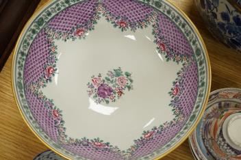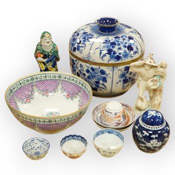 Lot 441 , A collection of 18th century and later Chinese porcelain to include blue and white tea bowls, a prunus flower jar and cover, to figures and a famille rose bowl, largest 27cm in diameter