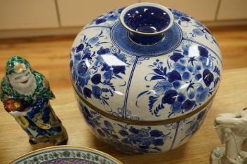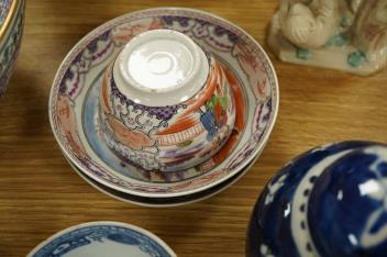 A collection of 18th century and later Chinese porcelain to include blue and white tea bowls, a prunus flower jar and cover, to figures and a famille rose bowl, largest 27cm in diameter
