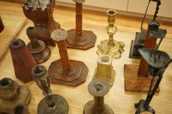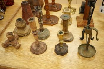 Lot 439 , A collection of 18th century and later pricket candlesticks and wrought iron rushlights, largest 27cm high