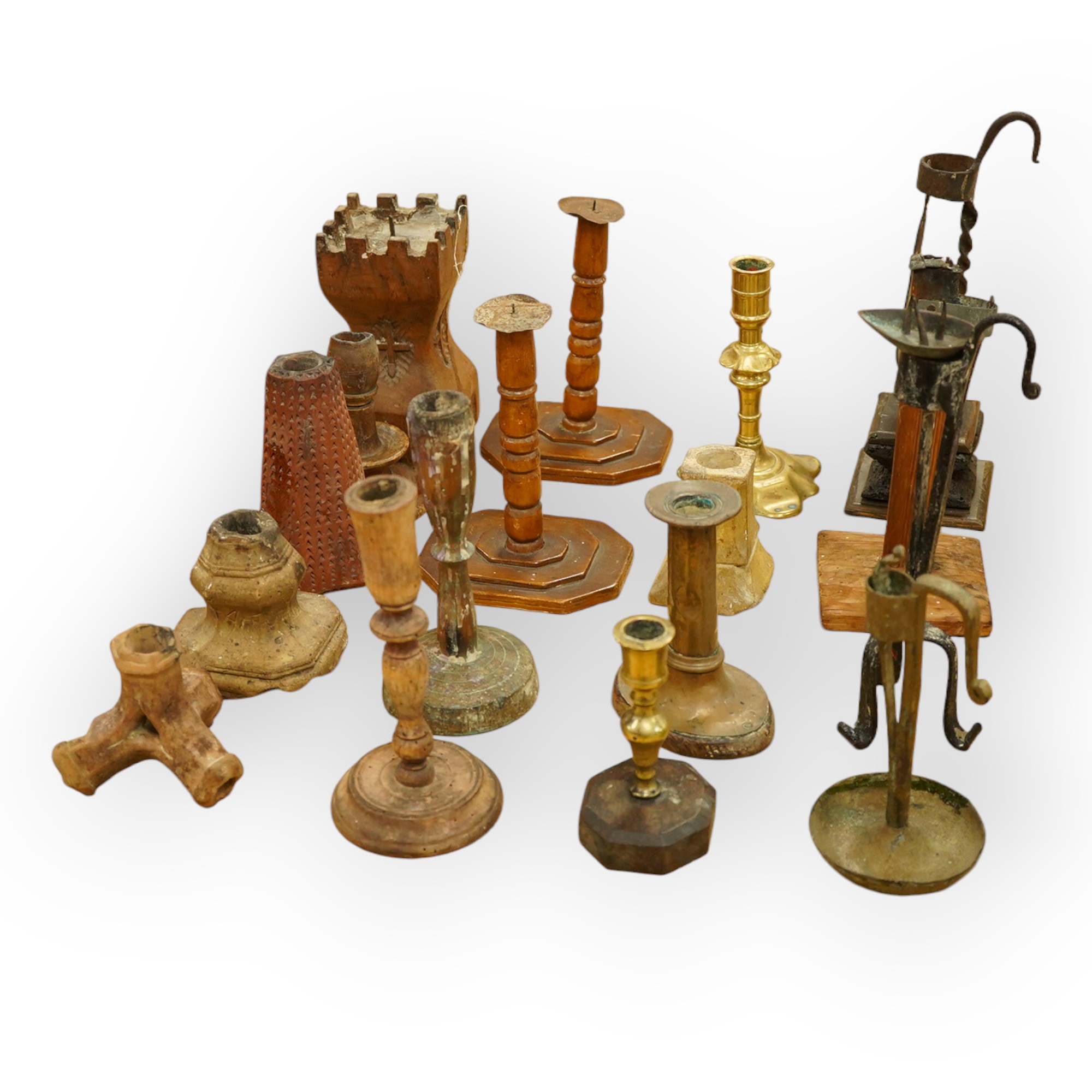 A collection of 18th century and later pricket candlesticks and wrought iron rushlights, largest 27cm high