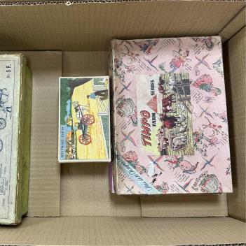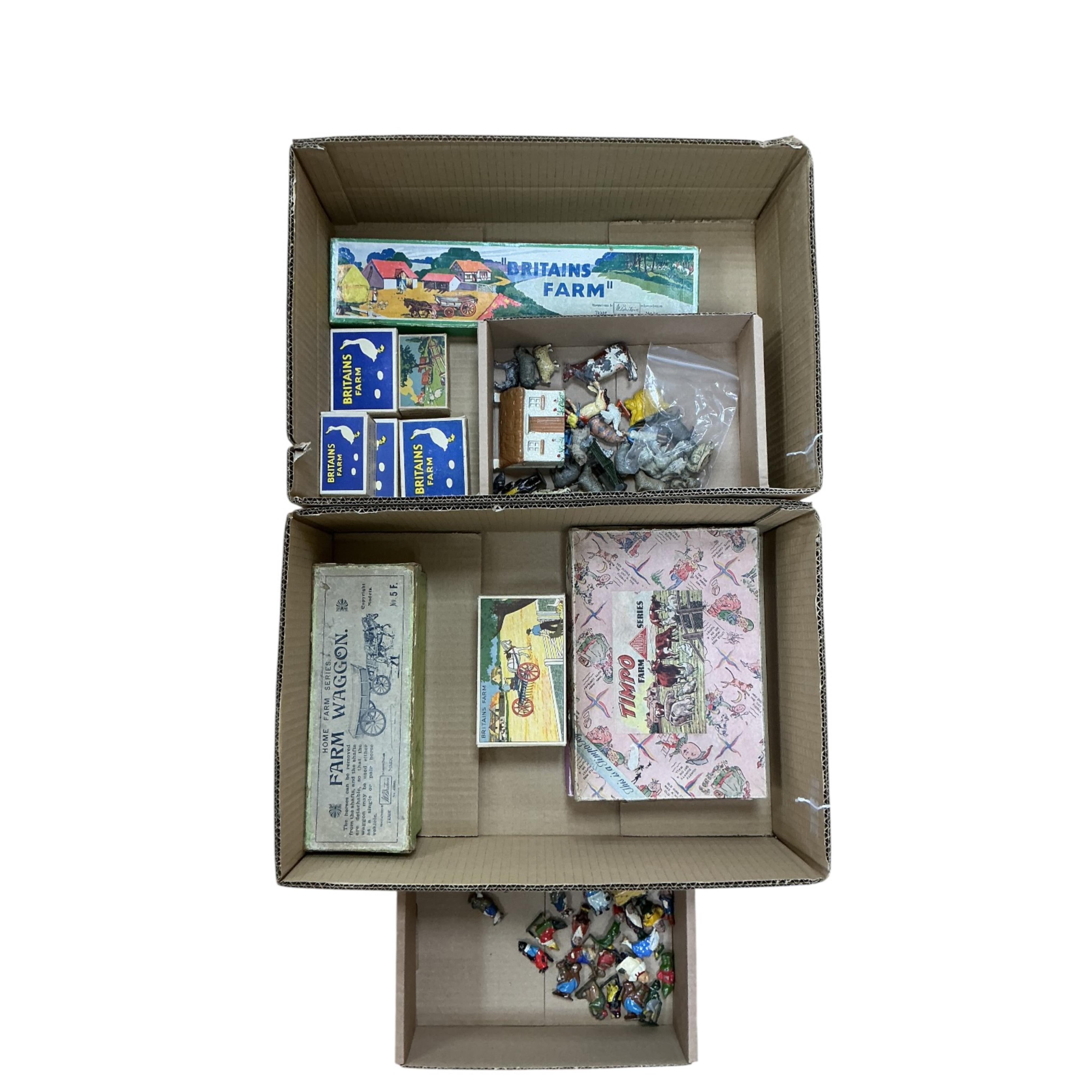 Lot 117 , A collection of 1930s-50s Britains and Timpo diecast sets, including eight boxed Britains Farm sets; a Farm Waggon (5F), a Horse Rake (8F), Farm hand with animals (147F), a Man with Tank on Wheeled Carrier (5034), and fo