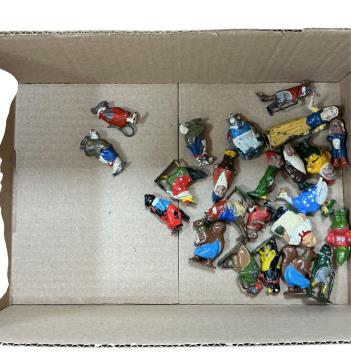 A collection of 1930s-50s Britains and Timpo diecast sets, including eight boxed Britains Farm sets; a Farm Waggon (5F), a Horse Rake (8F), Farm hand with animals (147F), a Man with Tank on Wheeled Carrier (5034), and four additional small sets, two boxed Timpo Farm sets, plus unboxed Britains animals and figures, a Britains Snow White and the Seven Dwarves (one dwarf missing), and a number of Britains for Cadbury’s Cococubs