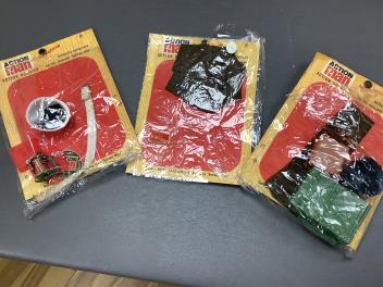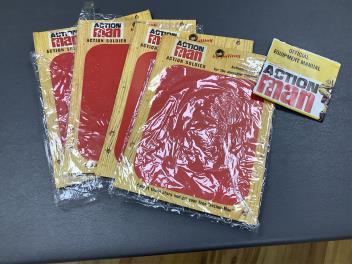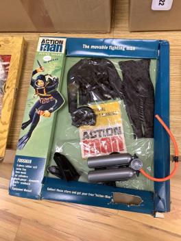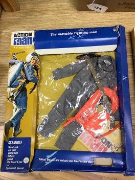 All boxed outfits have been opened and contents disturbed but appear unused; unknown whether all outfits are complete. Three Action Man equipment packets with some contents, four equipment packets empty.