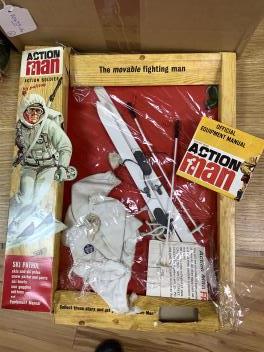 Lot 118 , A collection of 1960s Palitoy Action Man figures and accessories, including two boxed dolls, one doll issued for free in an original Palitoy shipping box with related paperwork, together with five packaged outfits; Ski P