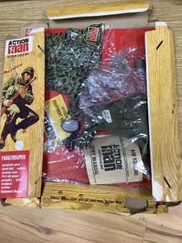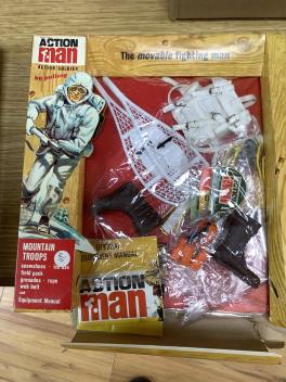 A collection of 1960s Palitoy Action Man figures and accessories, including two boxed dolls, one doll issued for free in an original Palitoy shipping box with related paperwork, together with five packaged outfits; Ski Patrol, Scramble, Mountain Troops, Frogman, and Paratrooper, plus three packaged accessory packs and four original backing cards for accessories, missing contents, the boxes and packets a.f., contents of the packs unchecked