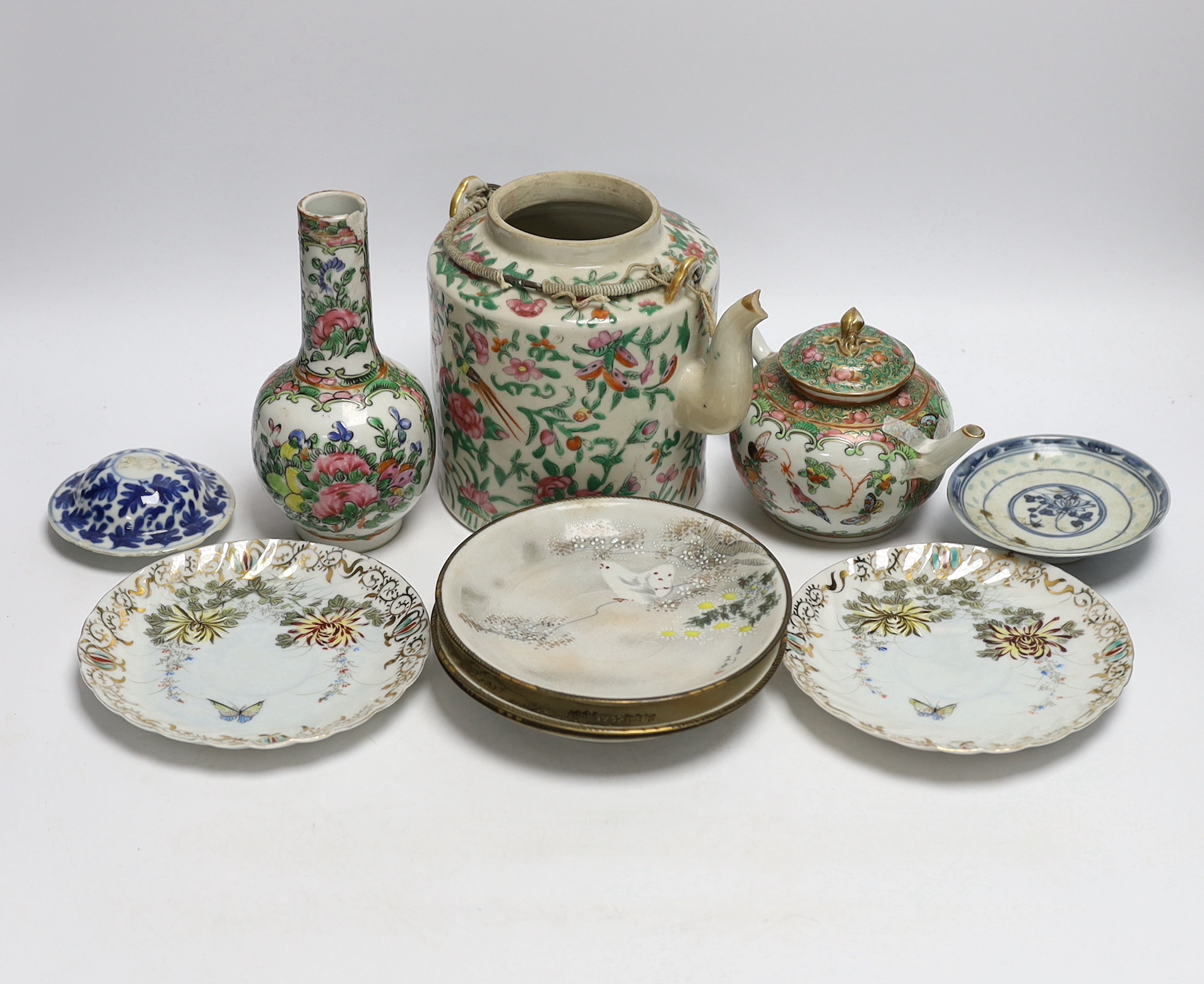A collection of Chinese and Japanese ceramics including two famille rose teapots, a vase, four saucers, etc. (8)