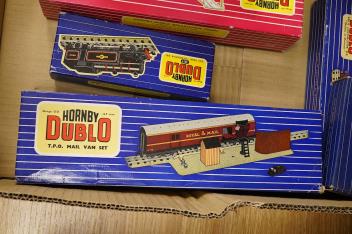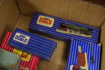 A collection of Hornby Dublo railway for 3-rail running, including three boxed locomotives; an LNER class A4 4-6-2 tender locomotive, Sir Nigel Gresley 7 (EDL1), a BR Duchess of Montrose 46232 (EDL12), and a BR class N2 0-6-2T locomotive, 69567 (3217), together with a T.P.O. Mail van set, a Breakdown Crane (4620), three box bogie coaches and four freight wagons, a quantity of track sections, some boxed, including six box sets of points, an early plywood station platform and a plywood locomotive shed, a D1 footbridge and a D1 signal cabin, both boxed, a number of constructed plastic kit buildings, controllers, Meccano catalogues, etc.