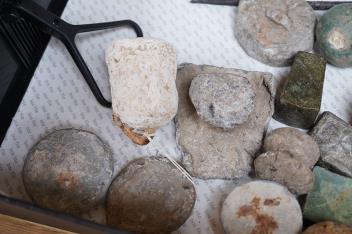 Lot 306 , A collection of Roman and other ancient lead weights in various forms bearing various cast marks, together with a cast iron pointer the handle in the form of a head