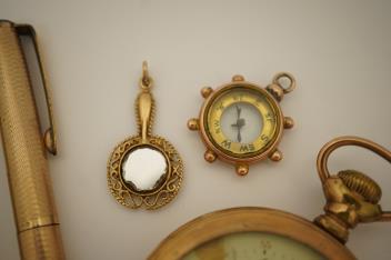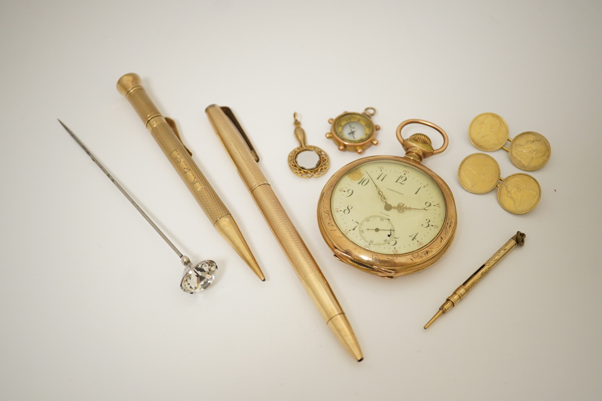 A collection of accessories, including a 9ct gold 'Everpoint' propelling pencil by S. Mordan & Co., circa 1932, British hallmarks, gross weight approximately 19 grams, initialled APS; a rolled gold ball point pen by Yard-O-Led; a smaller propelling pencil; a 9ct gold mirror charm pendant, British hallmarks, gross weight approximately 2.5 grams; a gilt metal open faced pocket watch, the dial signed Longines, the movement signed WH Mortimer, Pottsville, Pa; a 9ct gold compass pendant, British hallmarks for 1962, gross weight approximately 4 grams; a pair of gilt metal coin cufflinks; and a late 19th century hatpin set with a circular-cut paste