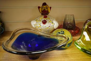 A collection of art glassware to include a Murano clown, Mdina paperweight, Orrefors crystal vase and various Freeform dishes, largest 28cm wide