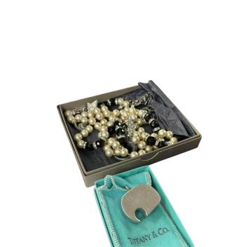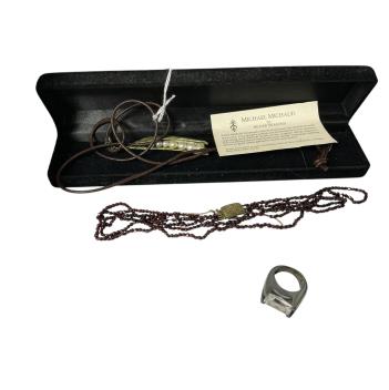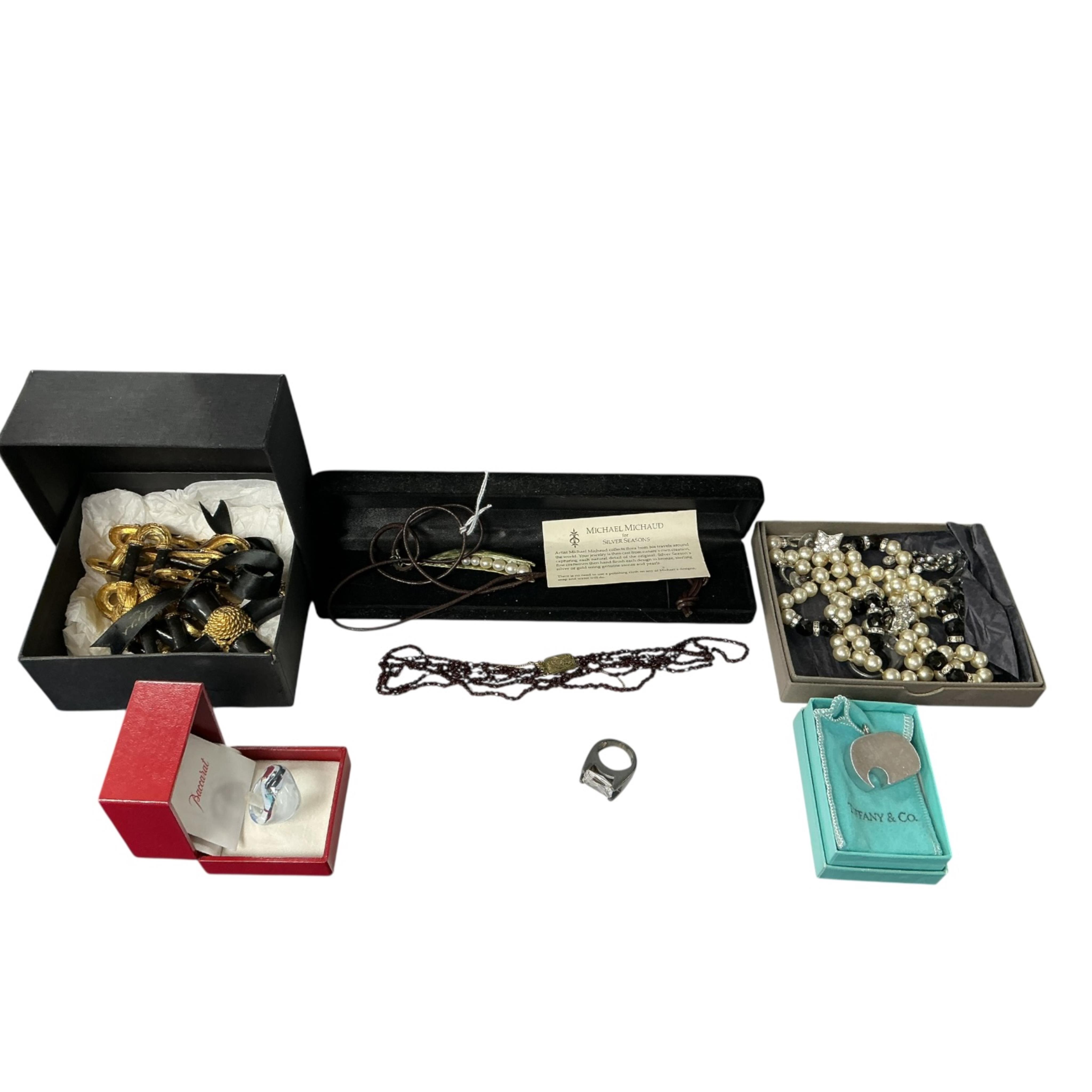 A collection of costume jewels, comprising: a black enamel and gilt necklace possibly by Kenneth Jay Lane, unsigned, one link broken; a glass ring by Baccarat; a cold painted metal and cultured pearl 'pea pod' pendant by Michel Michaud; a simulant pearl, faceted black and white paste necklace; a multi-strand garnet bead necklace; a stainless steel 'elephant' key ring by Georg Jensen, signed; three pairs of paste earrings and two paste rings