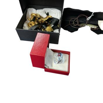 Lot 917 , A collection of costume jewels, comprising: a black enamel and gilt necklace possibly by Kenneth Jay Lane, unsigned, one link broken; a glass ring by Baccarat; a cold painted metal and cultured pearl 'pea pod' pendant by