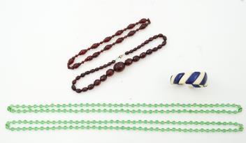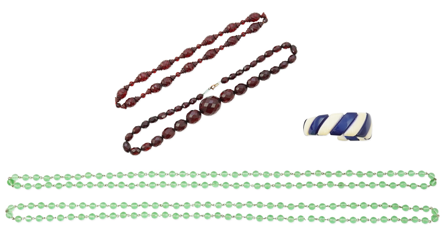 A collection of costume jewels, mid 20th century, comprising: two imitation amber necklaces, two long strands of green beads; and a striped blue and white plastic cuff, inner circumference approximately 18cm