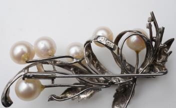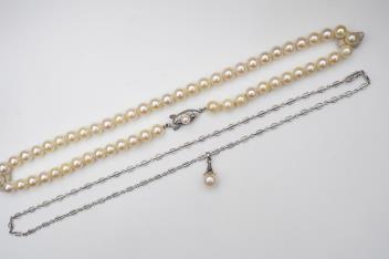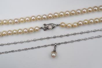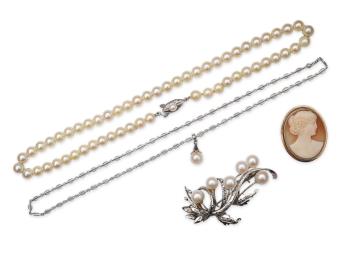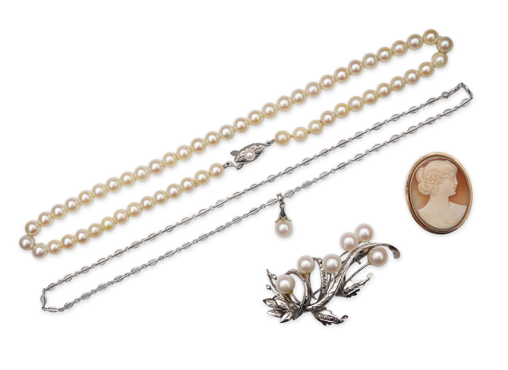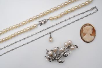 A collection of cultured pearl jewels and a cameo pendant, comprising: a cultured pearl brooch designed as an abstract floral spray, length 5.6cm, stamped 18K; a cultured pearl pendant on a chain, mounted in white gold, pendant 1.5cm, chain length 19cm, stamped 585, gross weight approximately 6 grams; a single-strand necklace of cultured pearls, to a silver clasp, length 36cm; and a shell cameo pendant in gold depicting a woman in profile, length 3.1cm, stamped 14K, gross weight 4 grams
