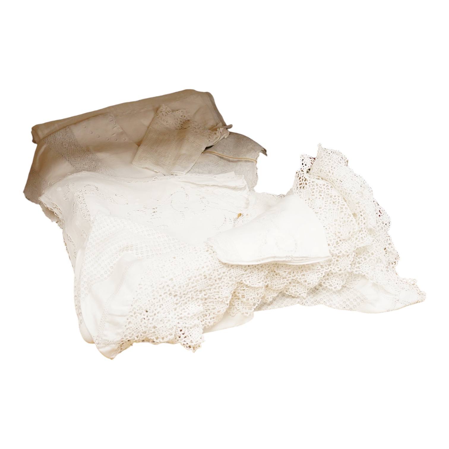 A collection of cutwork, needlework, filet, crochet and drawn thread worked table cloths etc