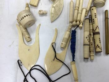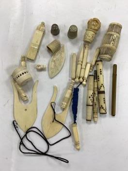 Lot 328 , A collection of early 19th century and later bone needlework bodkin cases, two thimbles etc. Condition- some wear and a few items cracked