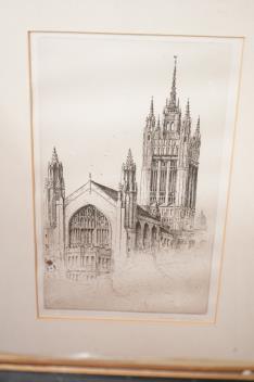 A collection of etchings and prints to include examples by C. Martyn, The Cat and Fiddle Inn, New Forest and a pair of etchings by Jackie Simpson, Graduation Hall, Narishal College, Aberdeen together with two pencil sketches, one by Max Morris, all framed