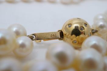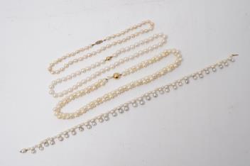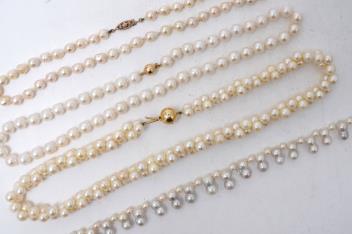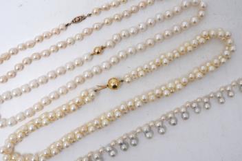 A collection of four cultured pearl necklaces, comprising: a necklace composed of conjoined cultured pearls, to a spherical gold clasp set with brilliant-cut diamonds, 47cm, stamped 750; a cultured pearl necklace suspending a fringe of conjoined cultured pearls, to a concealed clasp, length 39cm, stamped 750; and two single strand cultured pearl necklaces, length 39.5 and 45cm, clasps stamped 9ct and 375 respectively