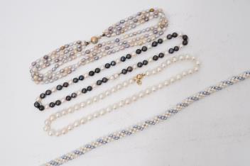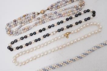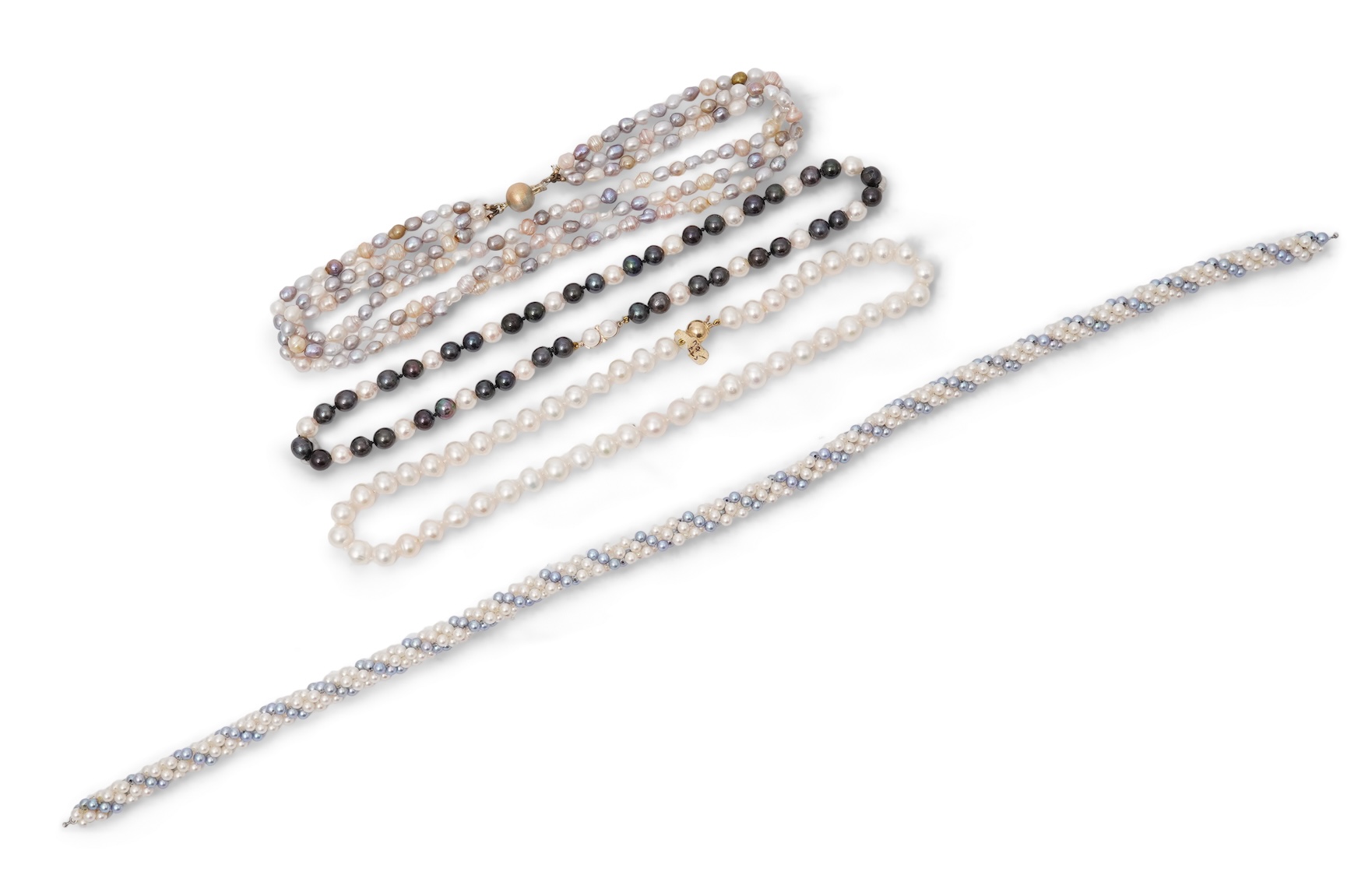 A collection of four cultured pearl necklaces, comprising: a single strand black and white cultured pearl necklace, to a gold clasp set with two cultured pearls, length 43.5cm, stamped 14K; a single strand necklace with a gold sphere clasp, length 44.5cm, stamped 375; a three-strand multicoloured necklace to a spherical gold clasp, length 39cm, stamped 750, Italian maker's marks; and a bicoloured cultured pearl necklace of rope design, to an openwork spherical clasp set with circular-cut sapphires, length 45.5cm