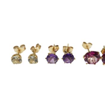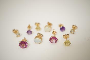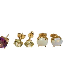 A collection of gem-set earrings, comprising: stud earrings respectively set with opals; pale blue topaz; coated pink tourmaline; amethysts; and citrines, each mounted in gold, combined gross weight approximately 5 grams
