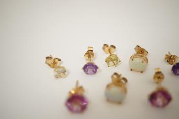 Lot 937 , A collection of gem-set earrings, comprising: stud earrings respectively set with opals; pale blue topaz; coated pink tourmaline; amethysts; and citrines, each mounted in gold, combined gross weight approximately 5 grams