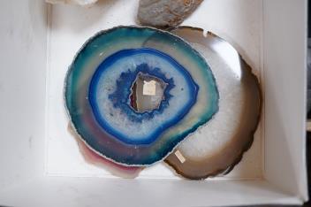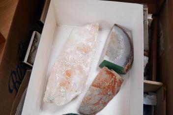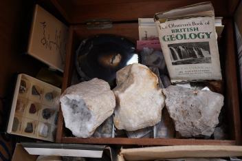 A collection of geological mineral specimens and fossils, including large quartz specimens, prepared cross-sections, fossilised tree sample, crystal formations, etc.
