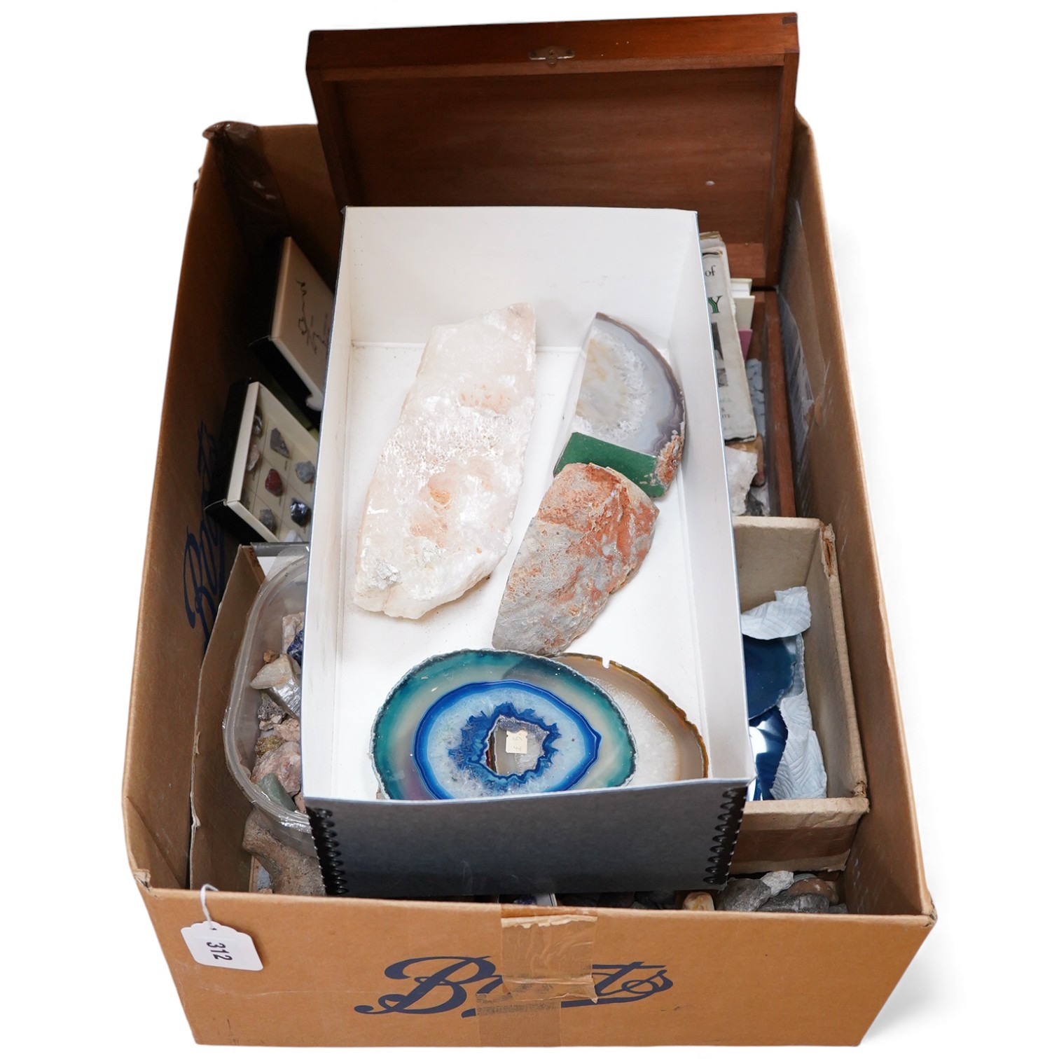 Lot 312 , A collection of geological mineral specimens and fossils, including large quartz specimens, prepared cross-sections, fossilised tree sample, crystal formations, etc.