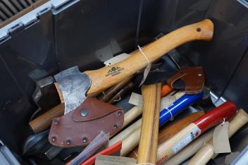 Lot 2254 , A collection of heavy duty hammers, framing hammers, and axes, including; 13 hammers by Vaughan, U.S.A., plus nine others by Stiletto, etc., and 14 carpenters axes and hatchets by James Howarth, Gransfars Bruks, Agdor of
