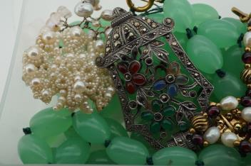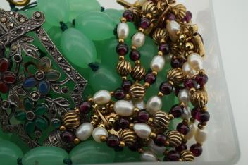 Lot 925 , A collection of jewellery, comprising: a pair of cultured pearl and rock crystal earrings; an Art Deco marcasite and multicoloured chalcedony giardinetto brooch, one chalcedony deficient; a garnet and cultured pearl neck