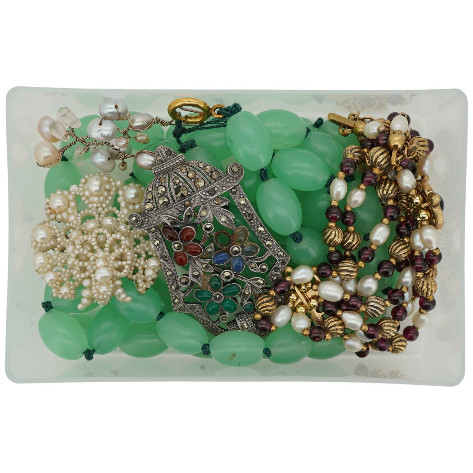 A collection of jewellery, comprising: a pair of cultured pearl and rock crystal earrings; an Art Deco marcasite and multicoloured chalcedony giardinetto brooch, one chalcedony deficient; a garnet and cultured pearl necklace in gilt metal; a Regency seed pearl and mother of pearl brooch, pearls untested; and a necklace composed of tonneau-shaped beads of green glass