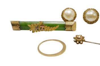 A collection of jewellery, including an Edwardian gold and seed pearl brooch, gross weight approximately 2.5 grams; a citrine ring in 9ct gold, British hallmark, split shank, gross weight approximately 4.5 grams; a gold stick pin and engine turned hoop; a pair of 9ct gold and mabé cultured pearl ear studs, British hallmarks, gross weight approximately 4.5 grams; and a gold and nephrite brooch, pin deficient